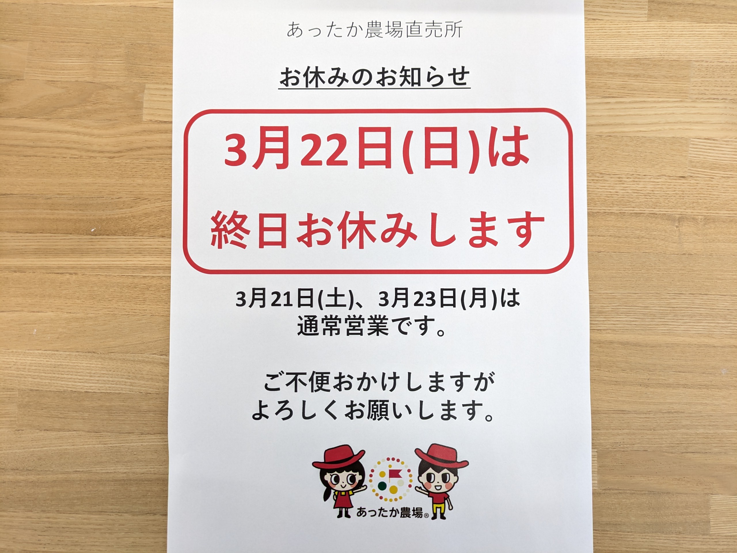 直売所 臨時休業のお知らせ(2026年3月22日(日))